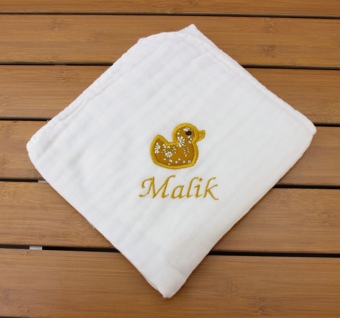 Le lange brodé peut être utilisé comme bavoir, posé sur l'épaule de maman après la têtée ou le biberon.
