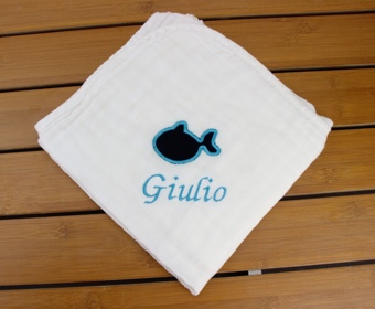Le lange brodé peut être utilisé comme bavoir, posé sur l'épaule de maman après la tétée ou le biberon.