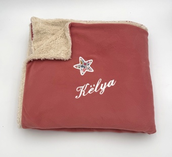 Vous pouvez personnaliser ce plaid en indiquant un prénom ou un nom de maison, la broderie sera faite sur le côté polaire, en haut à gauche, de la même couleur que le côté sherpa (écru)