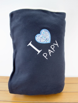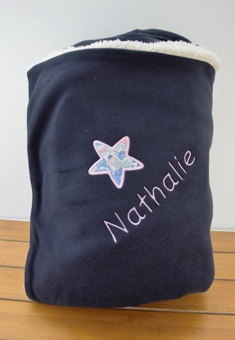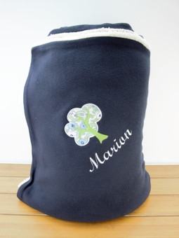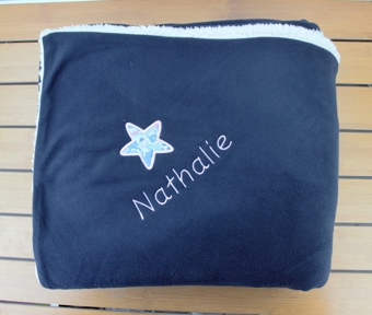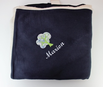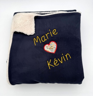 Vous pouvez personnaliser ce plaid en indiquant un prénom ou un nom de maison, la broderie sera faite sur le côté polaire, en haut à gauche, de la même couleur que le côté sherpa (écru)