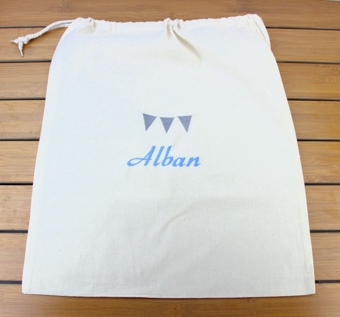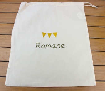 100% coton. Fermeture par lien en corde coulissant. Dimensions : 50 x 40 cm.